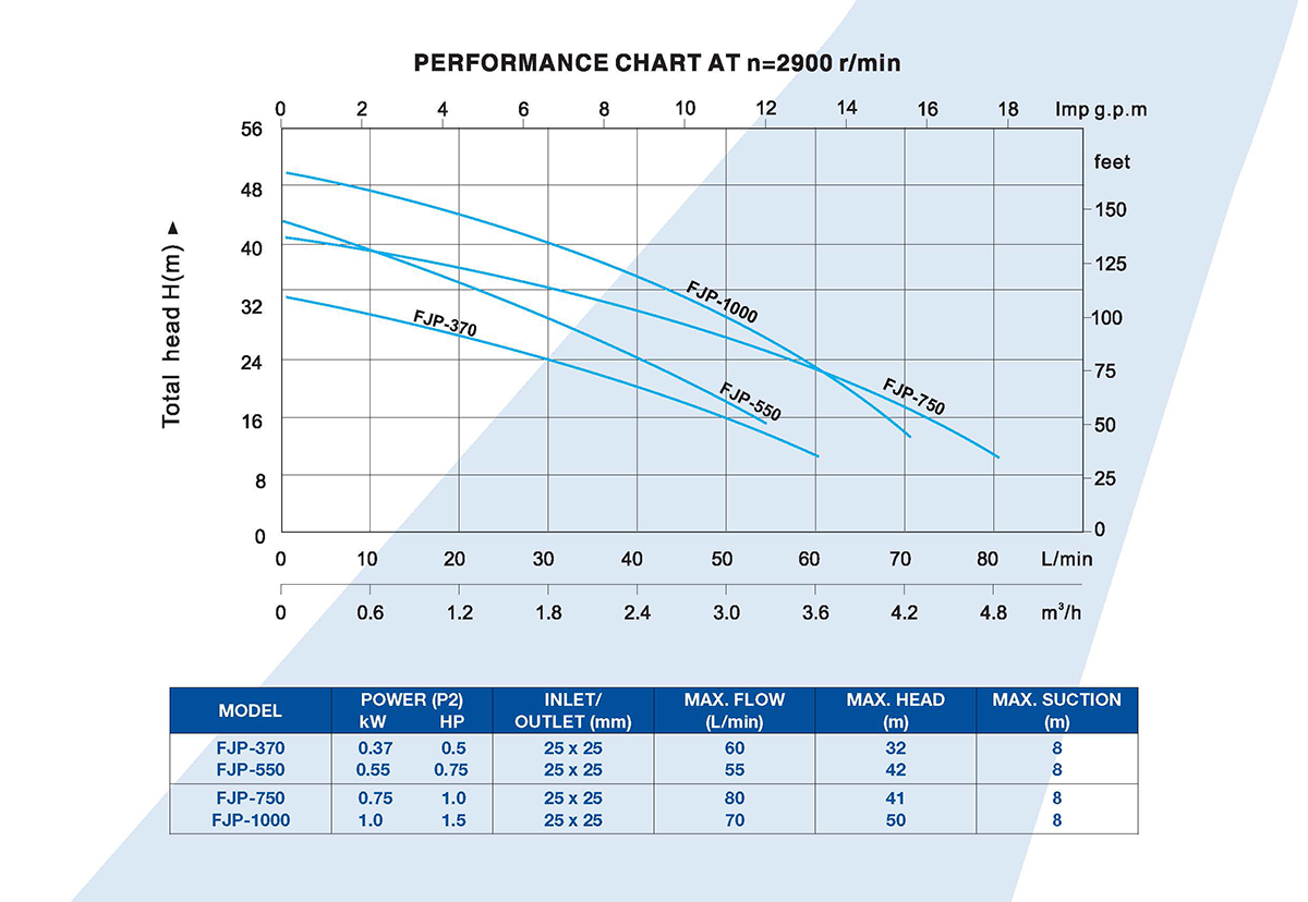 The FJP Series Offer a reliable range of horizontal self-priming jet pumps built with stainless steel components ideal for domestic and light commercial applications. These pumps are well-suited for tasks like household water supply, garden irrigation, and transferring clean water from tanks.